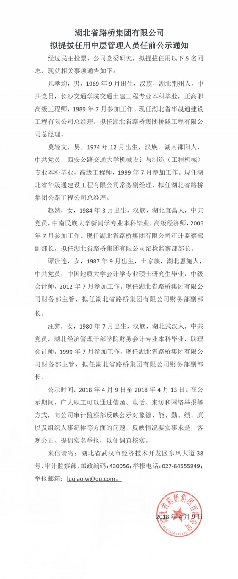 湖北省路橋集團有限公司擬提拔任用中層管理人員任前公示通知
