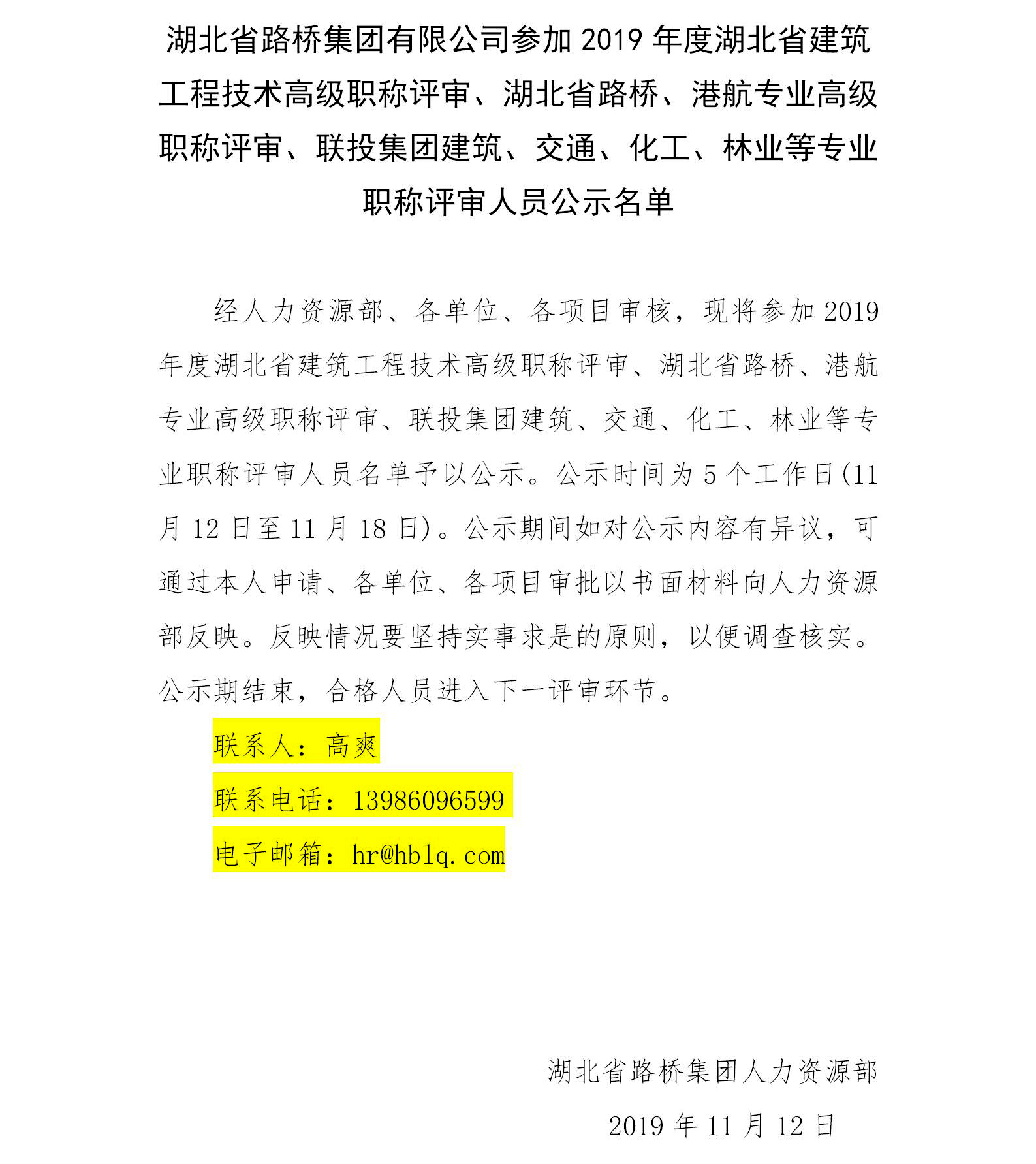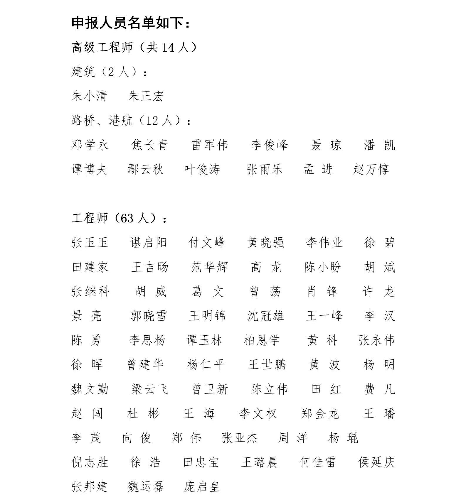 湖北省路橋集團(tuán)有限公司參加2019年度湖北省建筑工程技術(shù)高級(jí)職稱評(píng)審、湖北省路橋、港航專業(yè)高級(jí)職稱評(píng)審、聯(lián)投集團(tuán)建筑、交通、化工、林業(yè)等專業(yè)職稱評(píng)審人員公示名單