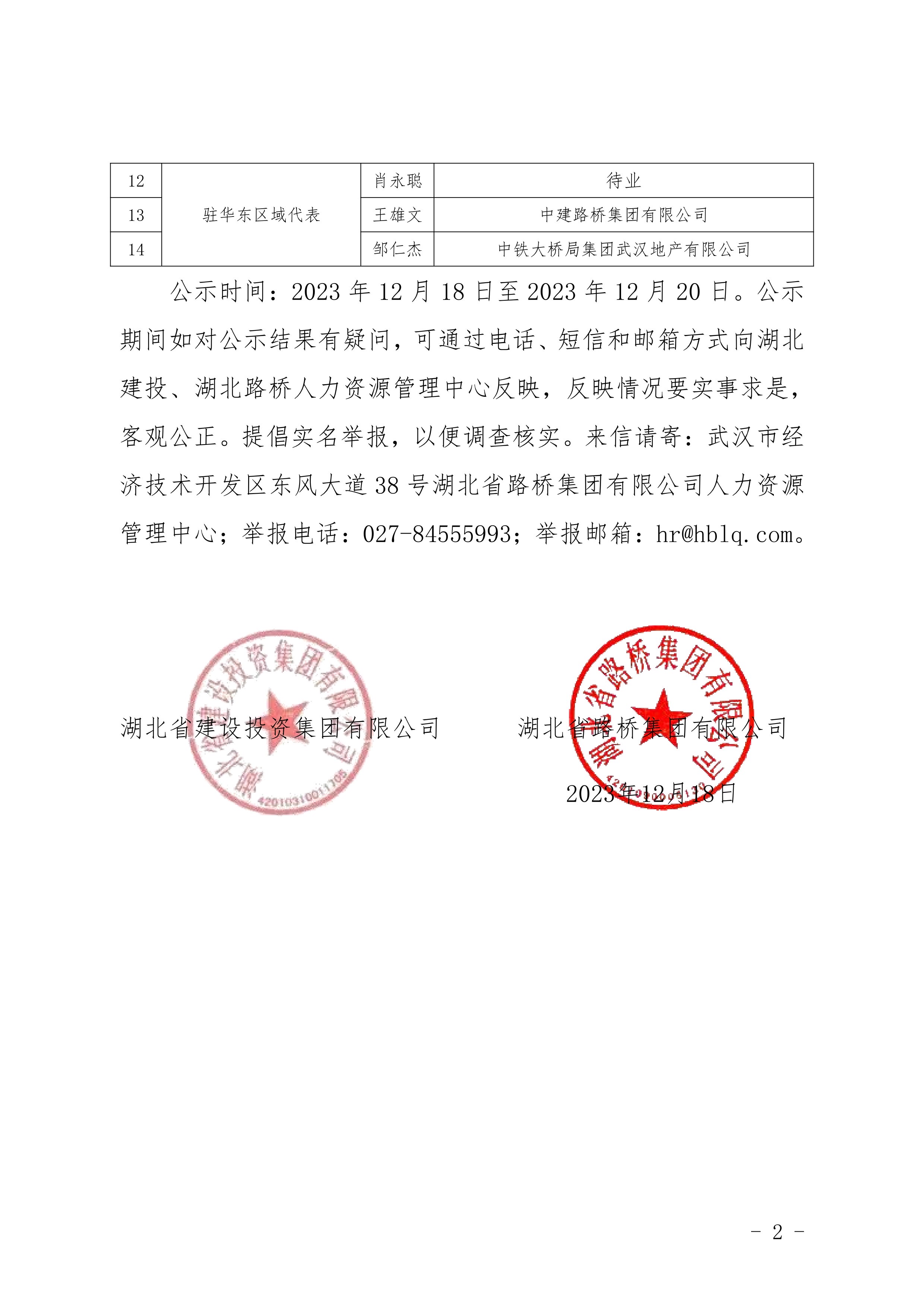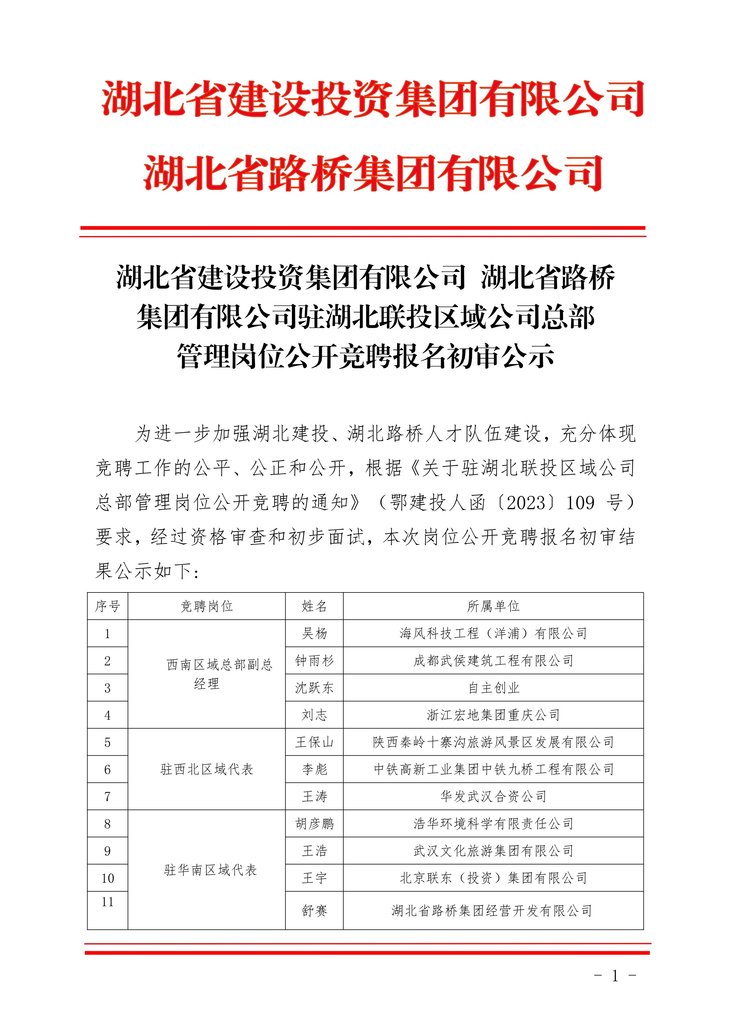 湖北省建設(shè)投資集團(tuán)有限公司、湖北省路橋集團(tuán)有限公司駐湖北聯(lián)投區(qū)域公司總部管理崗位公開競聘報名初審公示