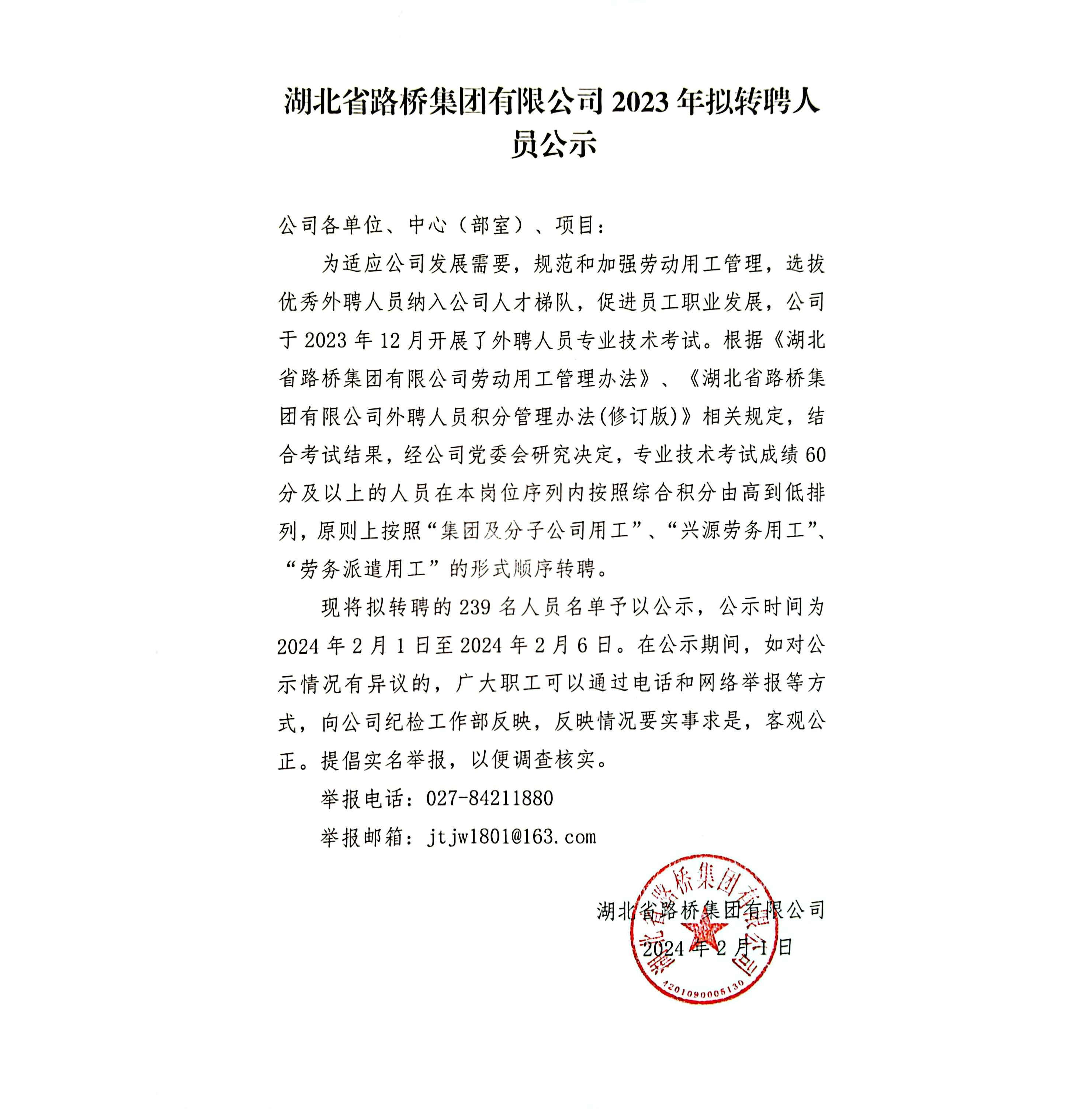 湖北省路橋集團(tuán)有限公司2023年度擬轉(zhuǎn)聘人員補(bǔ)充公示