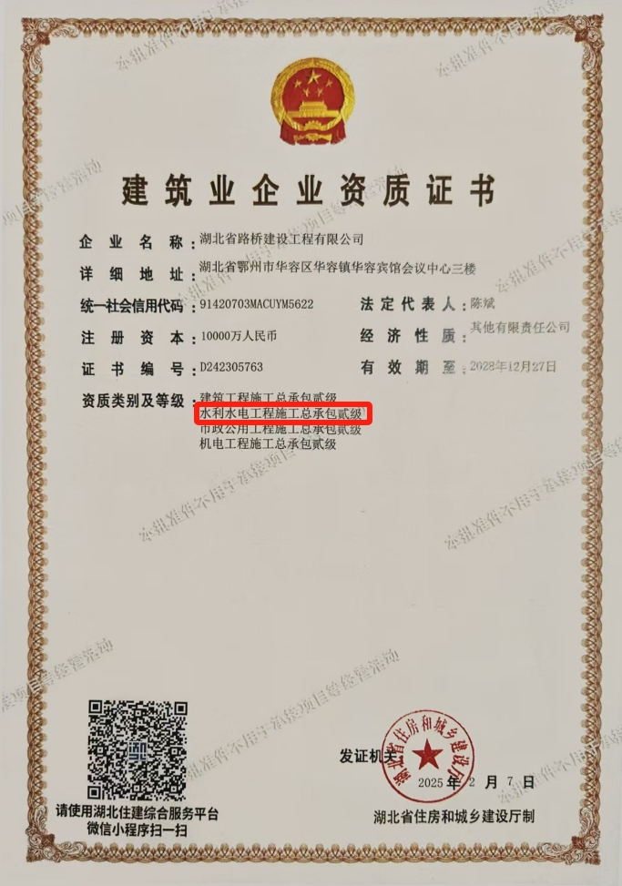 近日,經(jīng)湖北省住房和城鄉(xiāng)建設(shè)廳核準(zhǔn)審批,湖北省路橋建設(shè)工程有限公司成功取得水利水電工程施工總承包貳級(jí)資質(zhì)。這一成果有效完善了公司資質(zhì)體系,不僅是對(duì)公司在水利水電建設(shè)領(lǐng)域?qū)I(yè)實(shí)力和技術(shù)水平的權(quán)威認(rèn)可,更為公司在該領(lǐng)域的市場(chǎng)準(zhǔn)入提供了堅(jiān)實(shí)的基礎(chǔ)支撐,標(biāo)志著湖北省路橋建設(shè)工程有限公司可獨(dú)立承接水利水電工程。
