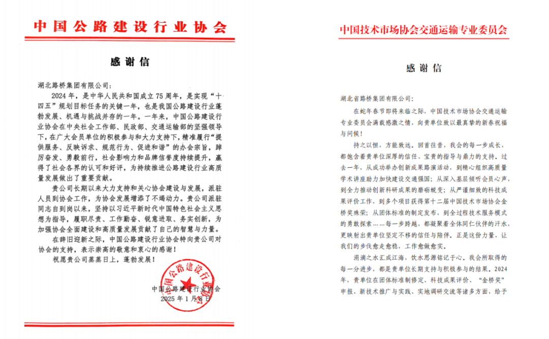 近日,湖北路橋收到來自中國公路建設行業協會、中國技術市場協會交通運輸專業委員會發來的感謝信,信中對湖北路橋大力支持和關心協會建設與發展,積極參與協會各項科技創新、評優創獎活動表達了肯定與感謝。