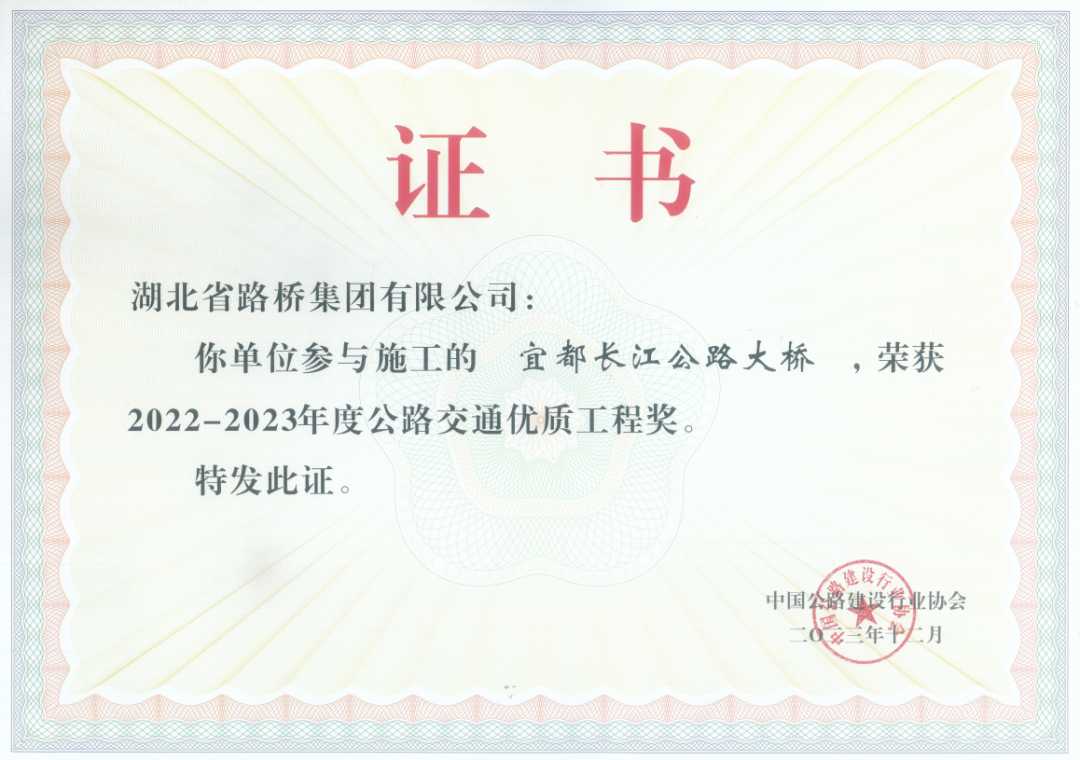 此外,湖北路橋一直致力于推動公路建設行業進步,并以積極開放的姿態,深度參與行業協會各項工作。在中國公路建設行業協會的大力支持和指導下,湖北路橋憑借深厚的技術積累、不懈的創新精神以及對工程質量的嚴格把控,取得了令人矚目的成績。15項工法在中國公路建設行業協會評為2024年度公路工程工法,宜都長江公路大橋、武穴公路長江大橋榮獲2022-2023年度公路交通優質工程獎(李春獎)的殊榮。