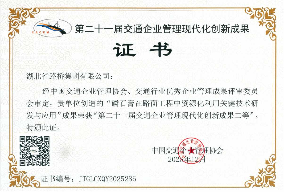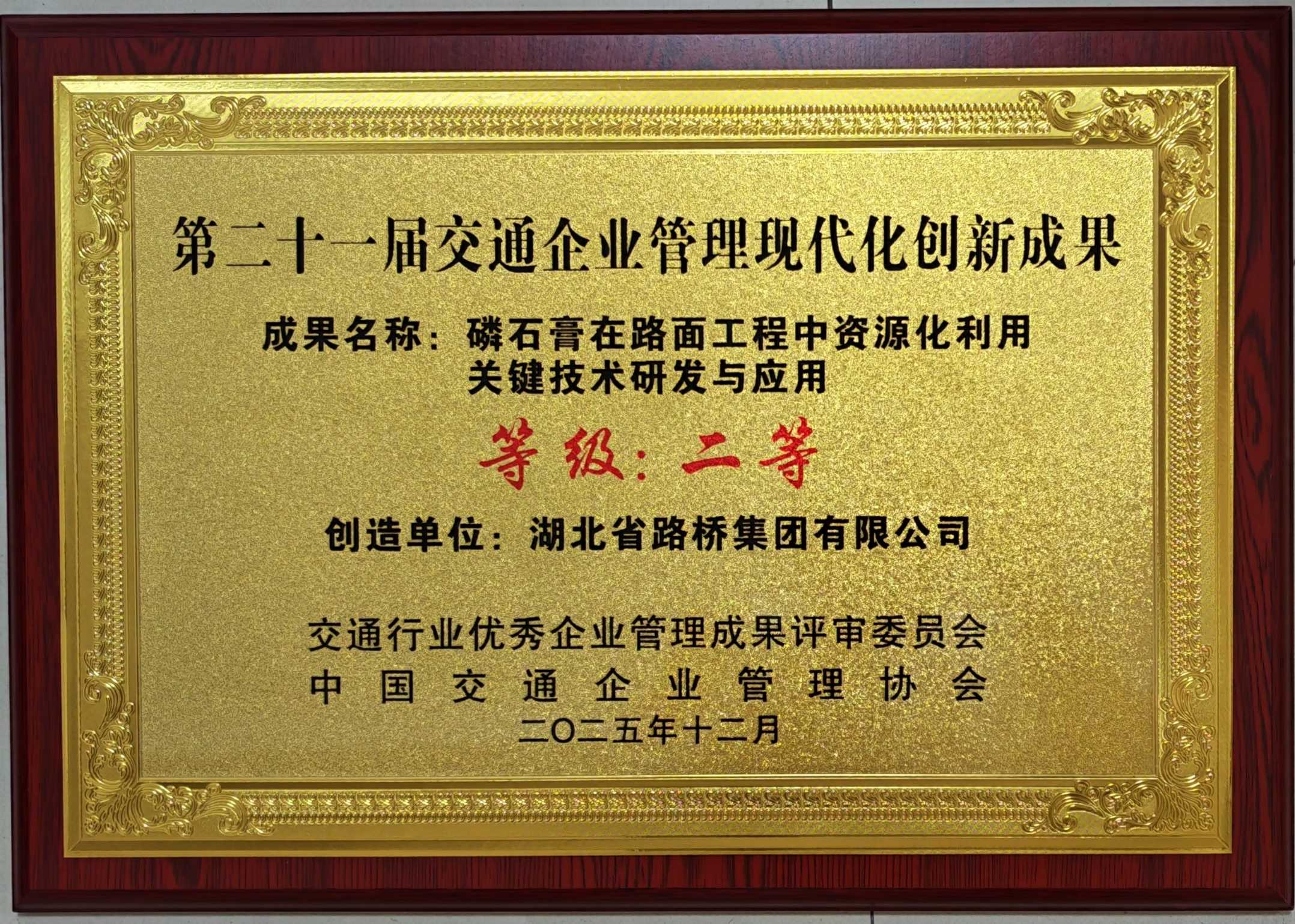 近日,由中國交通企業管理協會主辦的第二十一屆交通企業管理創新成果發布會在廣州順利召開,湖北路橋申報的《磷石膏在路面工程中資源化利用關鍵技術研發與應用》憑借突出的技術創新性、顯著的環保效益與廣闊的推廣應用前景,在眾多參評成果中脫穎而出,成功斬獲“第二十一屆交通企業管理現代化創新成果”二等獎。這一榮譽不僅是對湖北路橋在工業固廢資源化利用領域技術實力的高度認可,也標志著我國在工業固廢大規模資源化應用于交通基礎設施建設方面取得了又一重要突破。