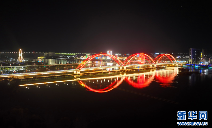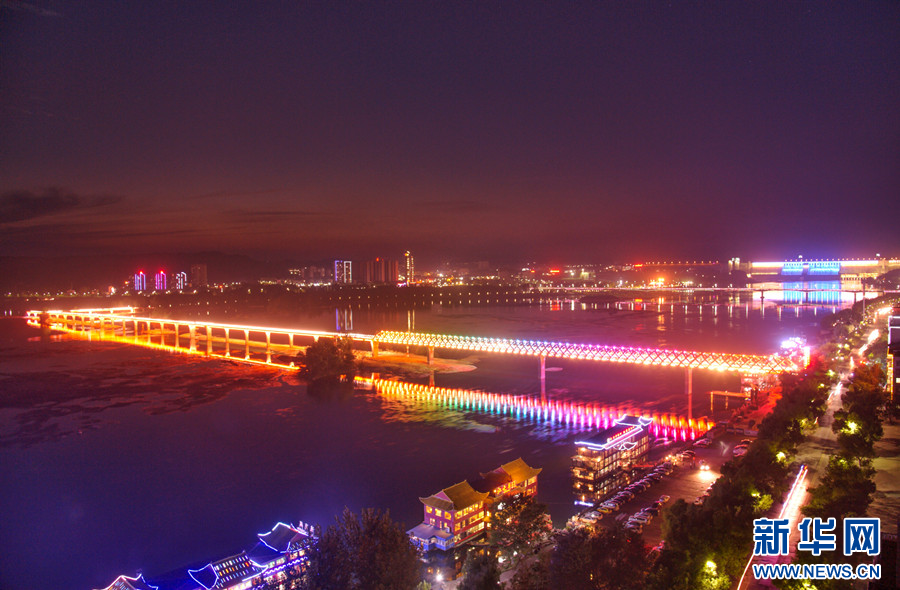 ??夜幕降臨,丹江口水都二橋霓虹閃爍,高聳的三跨拱架宛如幾道“彩虹”橫臥江面。
