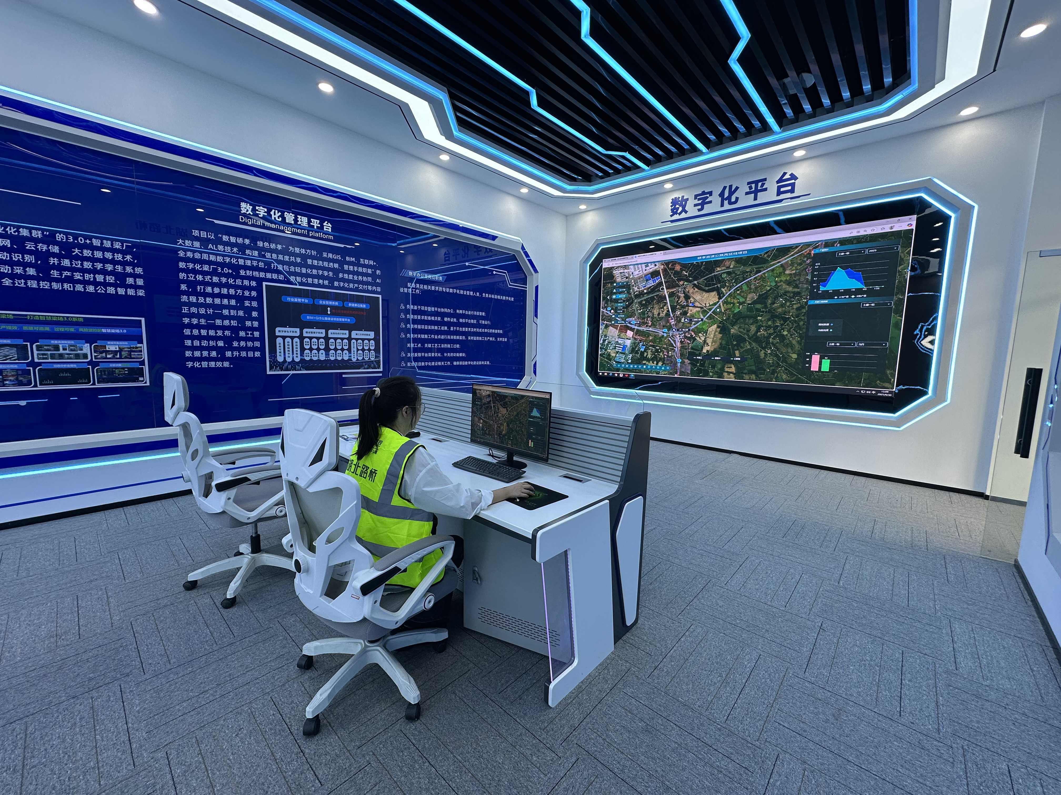 在項目部的數(shù)字化辦公室,電子屏幕上,整個項目的三維BIM模型清晰可見。項目總工徐耀輕點鼠標(biāo),即可隨意調(diào)取任一工點的實時畫面、進度數(shù)據(jù)、質(zhì)量檢測報告等信息。