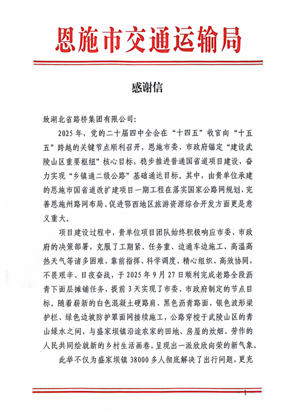 企業榮譽丨恩施國省道改擴建項目收到感謝信